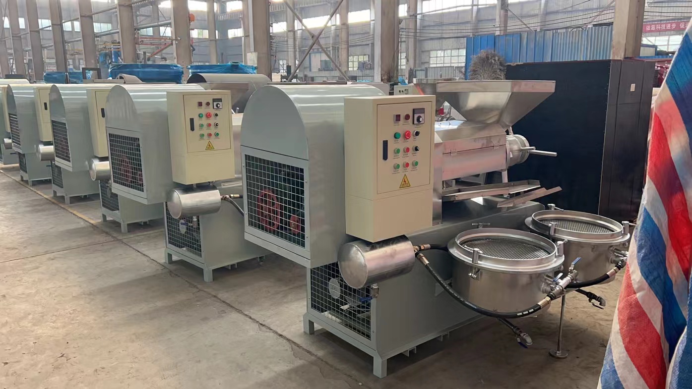7.新榨油機(jī)安裝后進(jìn)行4—8小時(shí)磨榨,方法是用已榨干油的餅料從料斗中緩緩喂入,反復(fù)回榨,使榨膛磨光,切記開始磨榨不要將料直接倒入料斗內(nèi),而以手抓喂入為宜,以防榨螺軸卡死。如喂料過猛,榨膛內(nèi)出現(xiàn)異常響聲或榨螺軸卡死,應(yīng)立即停車,消除梗阻,或重新裝配好后再啟動(dòng)磨榨,嚴(yán)禁強(qiáng)行拖車。8.正常榨油時(shí),必須保持進(jìn)料均勻,切勿過多過少或斷料空轉(zhuǎn)。此時(shí)機(jī)器負(fù)荷正常,運(yùn)轉(zhuǎn)平穩(wěn),響聲有節(jié)奏。出餅順暢,低壓段基本無渣,高壓段有少量油渣,但渣在油中的比例不大于10%,榨膛內(nèi)溫度可達(dá)150—200℃,出餅口出冒出青煙應(yīng)通過護(hù)罩由抽煙管排出。榨出熱餅要及時(shí)攤開,不要急于打堆或裝運(yùn),否則會(huì)產(chǎn)生自然現(xiàn)象。當(dāng)連續(xù)工作時(shí)間較長(zhǎng),機(jī)溫過高時(shí),應(yīng)采取電扇吹風(fēng)等降溫措施。